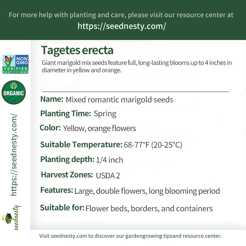 Mixed Romantic Marigold Seeds set the new standard for large marigolds. They have a robust plant and a long blooming period, with fully double flowers up to 4 inches in diameter. The flowers are bright yellow and orange, with short, curly, symmetrical, and rounded petals. The plants reach a height of 18 inches and a width of 12 inches. They are resistant to gray mold and tolerate drought and heat. They create a stunning display in beds, borders, and containers, creating a stunning wall of flowers when in bloom.