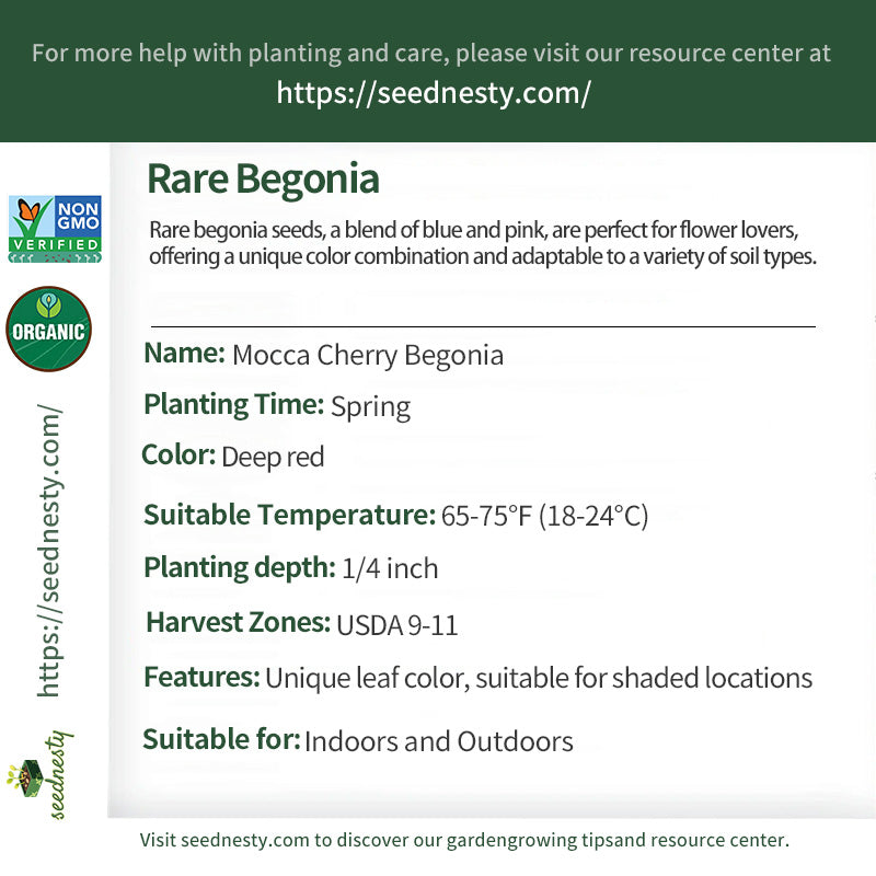 Mocha Cherry Begonias are unique plants with deep crimson leaves and vibrant flowers, resembling twinkling stars in the night sky. They prefer shade and add a touch of rich color to your interior. Imagine Mocha Cherry Dahlias quietly blooming, exuding their captivating charm, beside your desk or on a balcony. Growing them is simple and easy, making them accessible to both beginners and seasoned gardeners. Every watering and observation is a moment of connection with nature, allowing you to find a sense of tranquility amidst your busy lives.