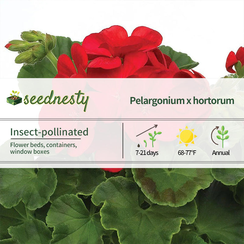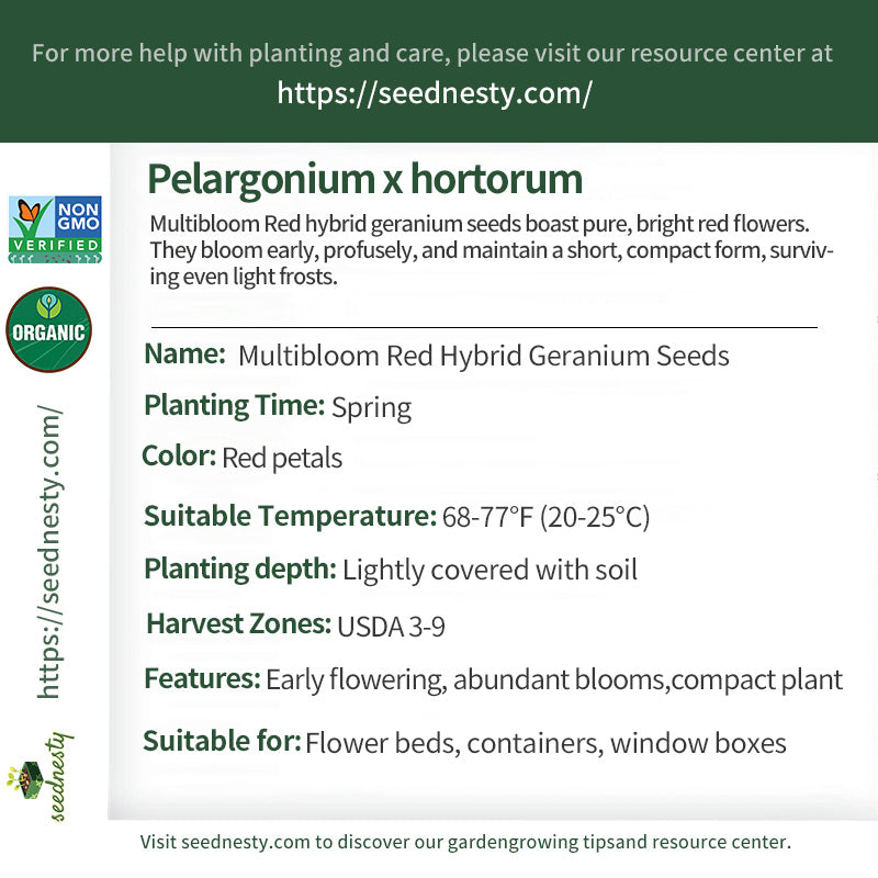 Plants grown from Multibloom Red hybrid geranium seeds boast exceptional flowering prowess. Their vibrant, deep crimson flowers stand out among other flowers. They bloom early, beginning just 10 weeks after sowing, when they reach 3.5-4 inches in height. Each plant can produce over ten flower heads simultaneously, maintaining a profuse display of blooms all summer long without becoming overly elongated, maintaining a short, compact, and graceful form. Even after light frosts, the flowers and plant remain in excellent condition, making them highly ornamental. They are ideal for bordering flower beds and can also be grown in containers, window boxes, and hanging baskets, bringing a vibrant red touch to any space.