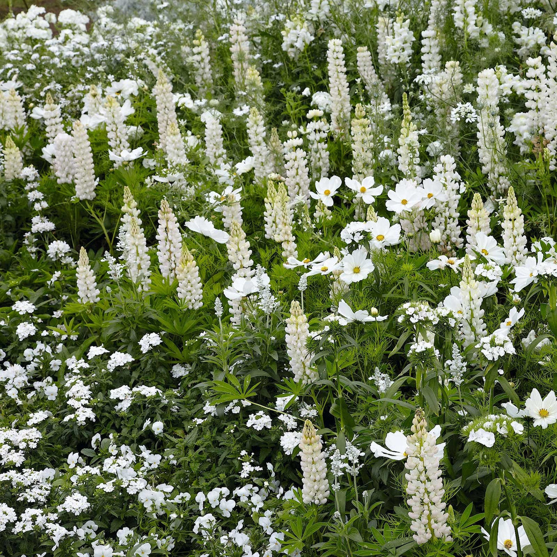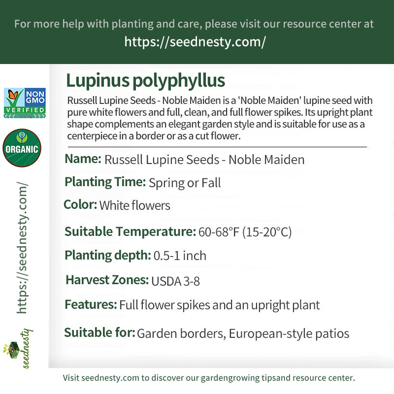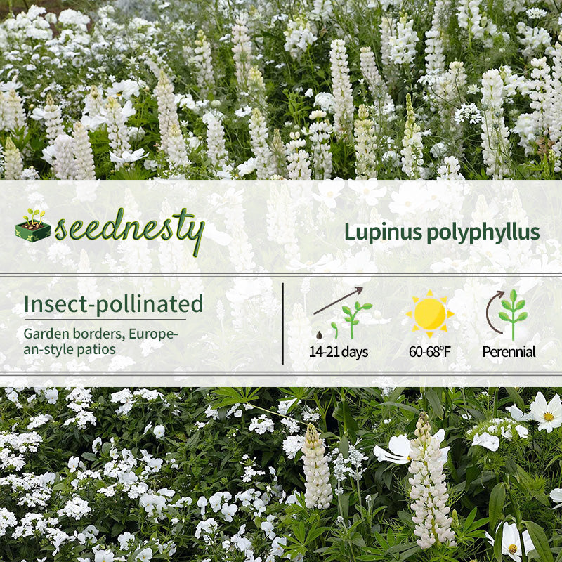 Russell Lupine Seeds - Noble Maiden is the "pure representative" of lupines. Its flowers are a pure, snow-white color, free of any distracting colors. Its petals are delicate, and its flower spikes are full and firm, approximately 16-20 inches long. When in full bloom, they resemble "white columns," exuding a noble and elegant aura, perfect for European or minimalist gardens. Plants grown from seed have an upright shape, sturdy stems, and strong support, making them resistant to falling even when their flower spikes are full. They are suitable for use as centerpieces in borders or as individual clumps along lawn edges. They are cold-tolerant and can overwinter in USDA zones 3-8, continuing to bloom healthily the following year after low winter temperatures. It is adaptable to a wide range of soils, preferring slightly acidic soils. Daily care requires adequate sunlight and avoid prolonged shade and dampness.