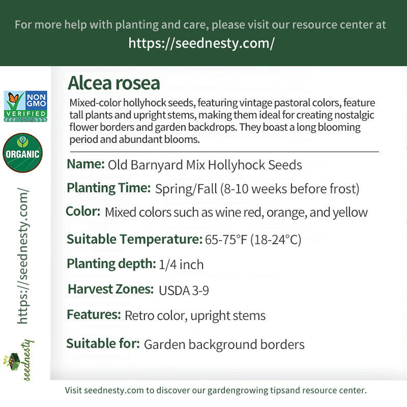 Old Barnyard Mix Hollyhock Seeds are a treasure trove for creating a vintage pastoral style. After sowing, tall, upright stems burst forth into a vibrant world of color—flowers in vintage hues like orange, crimson, and light yellow, appearing as if they've emerged from a bygone farmhouse. Each plant can grow to 6-8 feet tall, with straight, sturdy stems that stand proudly without support. Flowers are staggered along the stems, blooming continuously from late spring to midsummer. A gentle breeze creates a shimmering, retro effect. Perfect for garden walls and country flower borders, they add a touch of nostalgia and are a top choice for gardeners seeking to recreate pastoral memories.