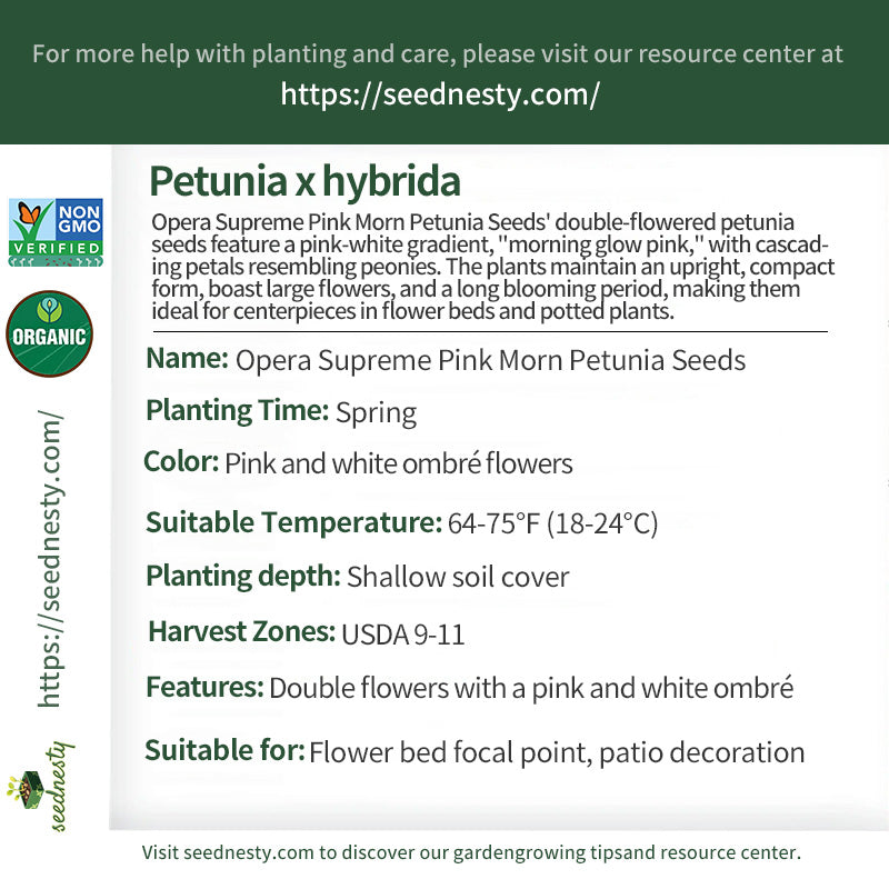 Opera Supreme Pink Morn Petunia Seeds' petunias are distinguished by their double flowers and unique color. The flowers are a soft "morning glow pink," with petals tinged with a hint of white, fading seamlessly into a soft, pink mist in the morning sun, creating a gentle, alluring image. The petals, stacked in layers, can number up to 10-15, creating a full, miniature peony-like bloom, measuring approximately 3-4 inches in diameter and displaying exquisite beauty in full bloom. The plants maintain an upright, compact form, reaching approximately 12-16 inches in height, with evenly branched branches that maintain their upright shape without the need for support. The leaves create a striking contrast with the pink-white flowers. Its flowering period lasts from spring to the first frost of autumn. As long as it receives ample sunlight, it will continuously produce buds. Its petals are also resistant to light rain and are not easily damaged by brief downpours.