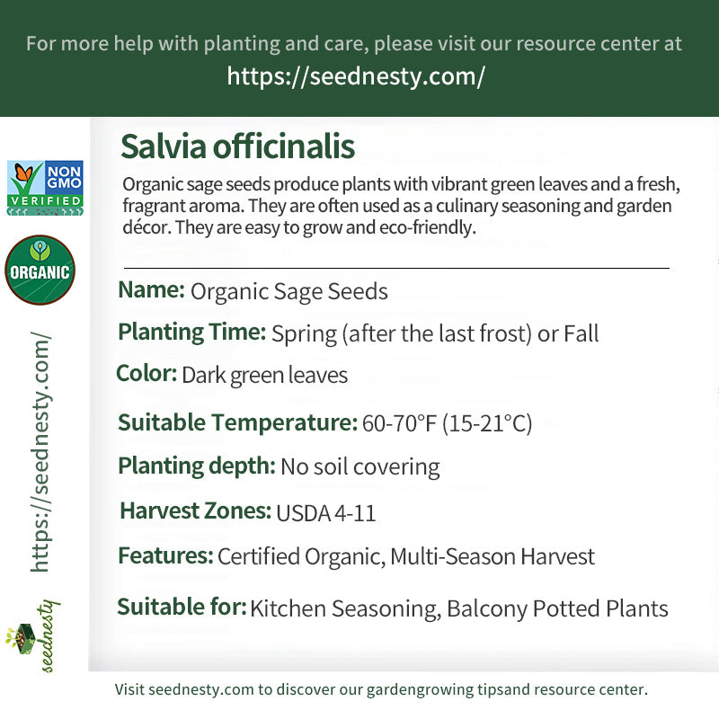 Organic Sage Seeds are certified organic sage (Salvia officinalis) seeds. They produce plants with thick, dark green leaves, finely haired, and a natural, herbal fragrance. The seeds adhere to organic standards, are chemical-free, and the cultivation process is environmentally friendly. Sage is highly adaptable, with small, delicate leaves in its early stages and compact, mature plants that naturally form clumps. Not only does it provide fresh seasoning in the kitchen (often used in Italian cuisine and barbecue seasoning), it also serves as an aromatic plant in garden borders and balcony pots. Its gray-green leaves and lavender flower spikes (blooming in summer) combine ornamental and practical value, attracting beneficial insects such as bees, contributing to an eco-friendly garden.