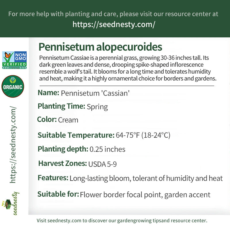 Penisetum Cassiae is a striking, dark-colored variety among ornamental grasses. As a perennial herb, it grows 30-36 inches tall, with sturdy, upright stems and thick, dark green leaves with smooth edges. It grows in dense, clumps, forming a compact, smooth, and tidy plant. The key attraction is the dense, cylindrical, drooping spike of flowers, which begins to emerge in late summer and grows 5-8 inches long. These flowers are soft to the touch and rich in color, creating a striking contrast against the green leaves, creating a striking visual impact. This variety is highly resistant to humidity and heat, and is less likely to fall over or become diseased in hot, rainy southern regions. It blooms more profusely in full sun, with a flowering period that continues into autumn.