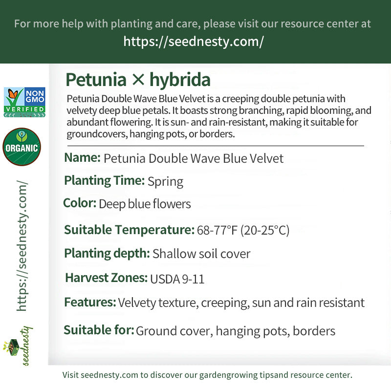 Petunia Double Wave Blue Velvet is a classic creeping double petunia, combining the advantages of double blooms with a creeping growth pattern. Its petals are a rich deep blue, covered in fine hairs, giving it a velvety feel and a more luxurious appearance than typical blue petunias. The flowers are a double rosette, with layers of petals forming a dense, dense pattern. The flowers are approximately 2.5-3.5 inches in diameter and are densely packed, with 5-8 blooms per creeping branch. The plant has a strong branching ability, and the branches can extend to 30-40 inches. When planted in the ground, it can form a "blue velvet flower carpet" in 2-3 months. When planted in a hanging pot, it will hang down into a plump flower ball with a diameter of about 50 cm. It is highly resistant to sunlight and rain, and its color remains resistant to fading even in strong summer sunlight.