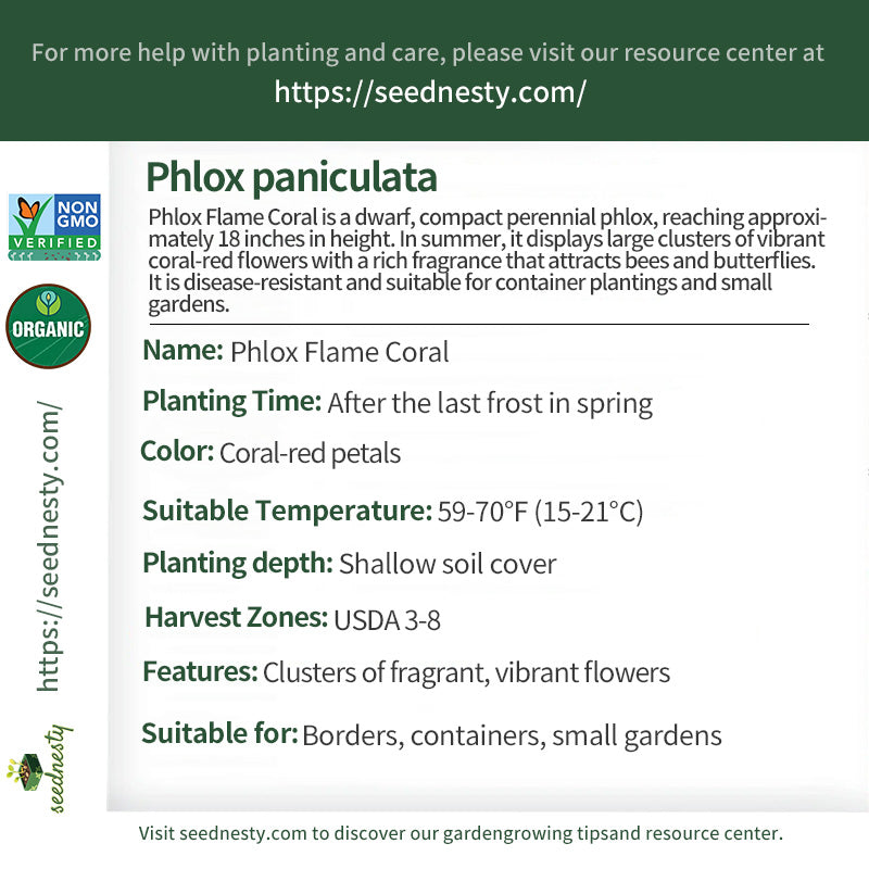 Phlox Flame Coral is an attractive perennial phlox. Its naturally dwarfed, compact, shrub-like form, typically 15-18 inches in height, makes it a great addition to small gardens and balconies, as well as for edging or adding to mixed borders. Its medium green, lanceolate leaves, arranged alternately along the stem, have a soft, glossy texture. Starting in midsummer, large clusters of vibrant coral-red flowers with trumpet-shaped petals appear at the top of the plant, forming balls up to 4-5 inches in diameter. The vibrant color and pleasant fragrance of the flowers attract butterflies, bees, and hummingbirds. The blooms last for several weeks, adding a warm and romantic touch to any summer garden.