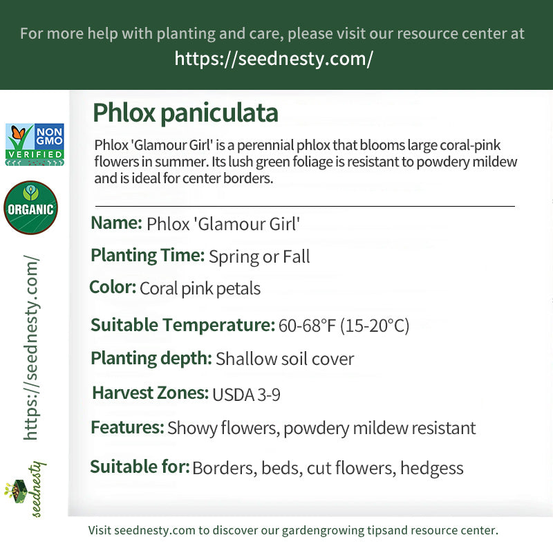 Phlox 'Glamour Girl' is a charming perennial phlox. In midsummer, it displays large, vibrant coral-pink flowers on sturdy stems. Its fragrant blooms attract butterflies and hummingbirds. Its lush green foliage is highly resistant to powdery mildew. Reaching a height of 28-32 inches, it is suitable for center borders or as a cut flower, adding color and beauty to gardens and interiors. It tolerates heat and humidity and thrives in full sun with moist, well-drained soil.