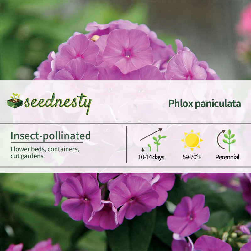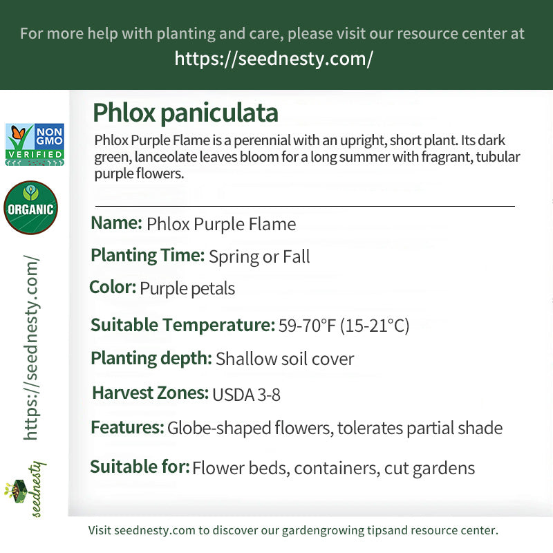 Phlox Purple Flame is a charming perennial herb. Its upright, relatively short plant, typically 12-16 inches tall, maintains a compact form, minimizing its footprint. Its tough leaves provide a beautiful backdrop for the flowers. Its peak bloom occurs in summer, with tubular, bulbous flowers clustered in large, bright purple hues. The petals are a lighter shade on the underside, shimmering in the sunlight. Each flower has a striking dark center, adding to its unique charm. The flowers are richly fragrant, and the fragrance wafts through the breeze. Not only is it an ornamental plant, it also attracts insects such as butterflies and bees, bringing life to the garden.