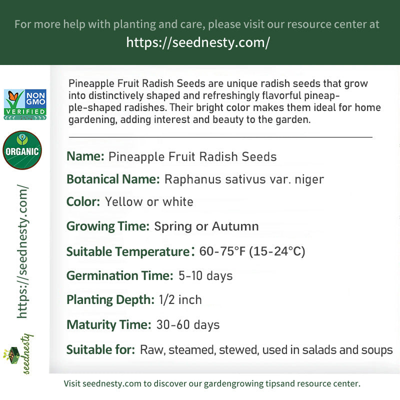 Pineapple Fruit Radish Seeds are unique radish seeds that grow into distinctively shaped and refreshingly flavorful pineapple-shaped radishes. Their bright color makes them ideal for home gardening, adding interest and beauty to the garden.