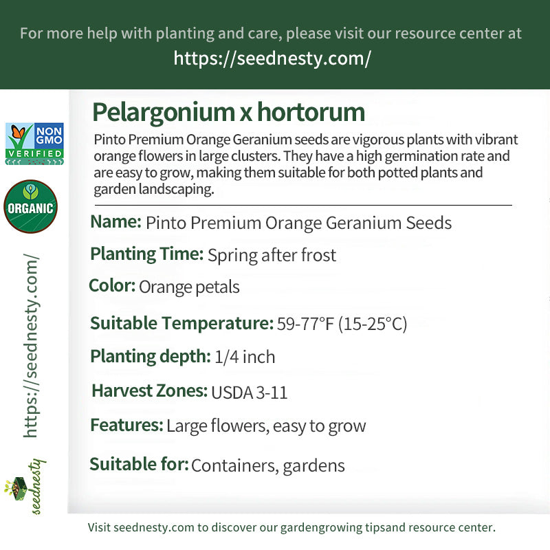 Pinto Premium Orange Geranium seeds produce vigorous plants. They are easy to grow and thrive without the need for elaborate care. The flowers are a vibrant orange, with large clusters reaching 4-5 inches in diameter, making them a striking feature on the plant. The seeds have a high germination rate, offering flexible planting times. They can be sown outdoors directly after the last frost. For earlier flowering, they can be sown indoors in early spring and transplanted 8-10 weeks later. They thrive in well-drained soil rich in organic matter. Whether used as a potted plant for indoor or outdoor use or in a garden landscape, their vibrant orange flowers create a striking visual focal point.