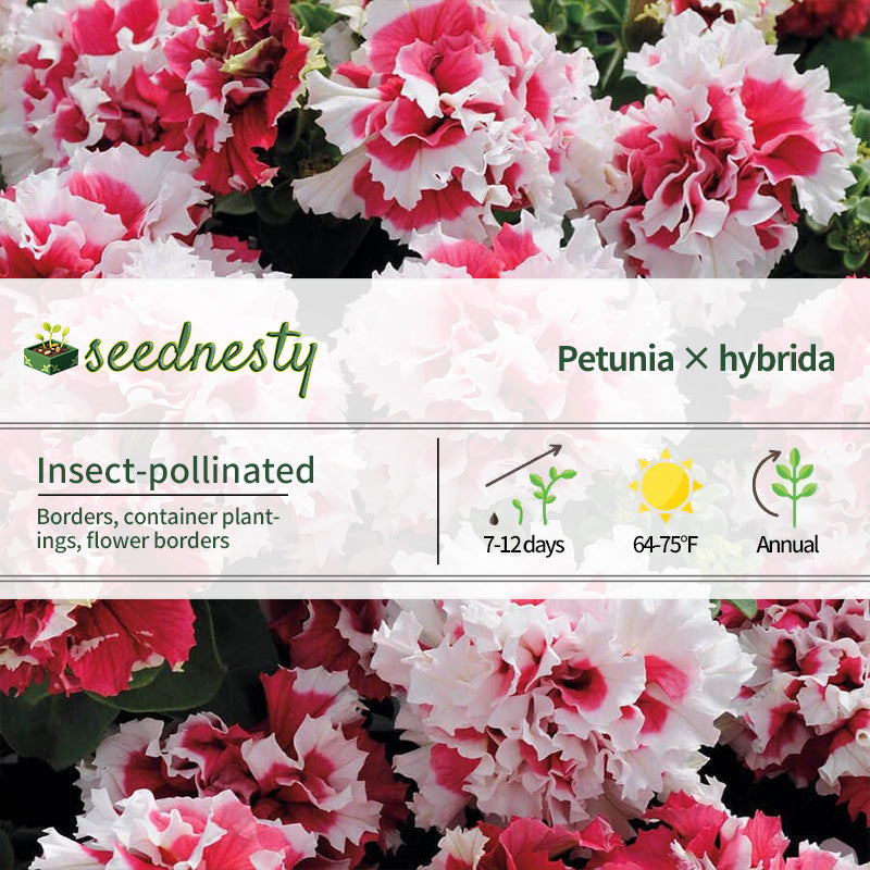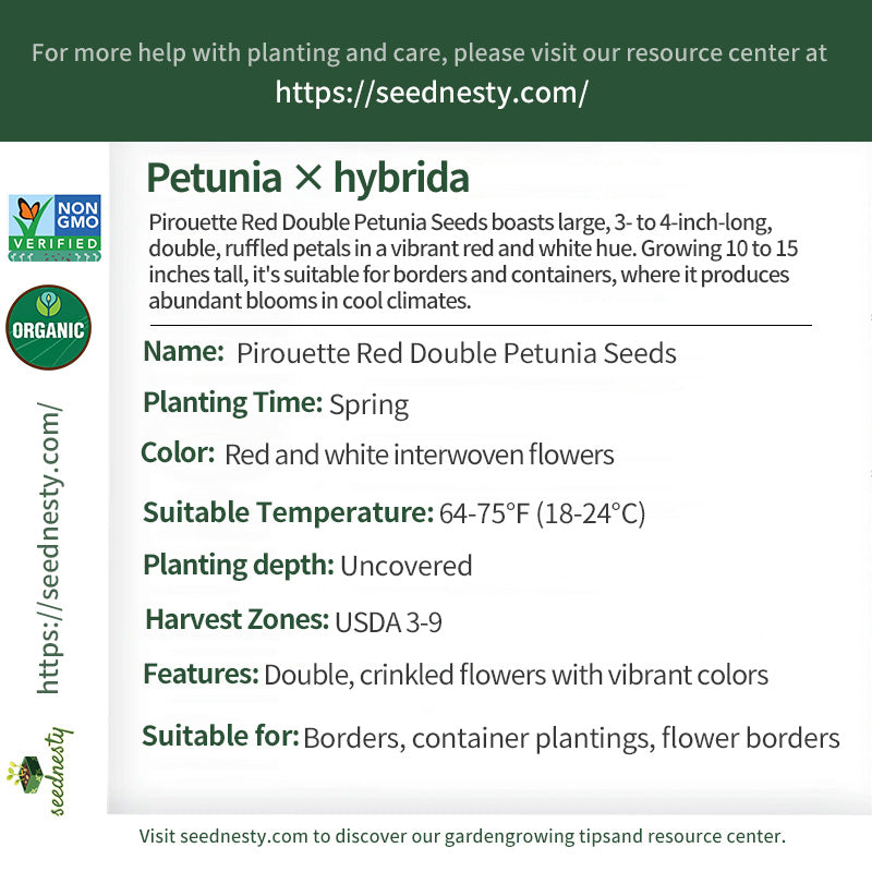 Pirouette Red Double Petunia Seeds produces stunning petunias. The flowers reach 3- to 4-inch diameters, with cascading double petals resembling intricately sculpted works of art. The interwoven red and white petals create a striking contrast that complements the main body. Growing 10- to 15-inches tall, it creates a beautifully layered effect at the front of a border, complementing taller flowers behind. It also offers a unique display in containers like pots and buckets. In cool, mild climates, it blooms tirelessly and profusely, providing a lasting display of vibrant color.