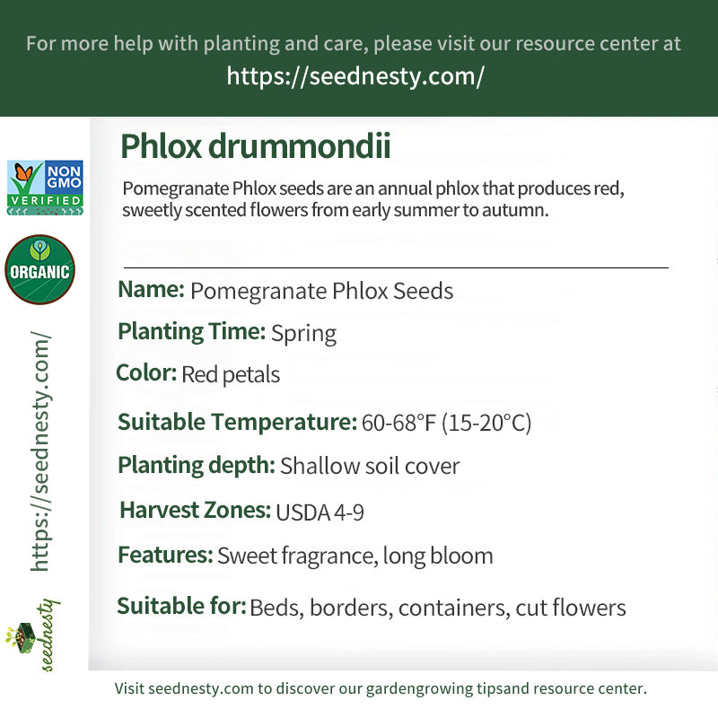 Pomegranate Phlox is an annual phlox grown from seeds. Its flowers are distinctive red, approximately 1.5 inches in diameter, and have a sweet fragrance. Blooming begins in early summer and, in favorable weather and with ample water, continues into autumn, only stopping when frost arrives. The plant reaches a height of 14-20 inches with a crown width of approximately 12 inches, making it suitable for planting in beds, borders, or containers. It can also be grown as a cut flower.
