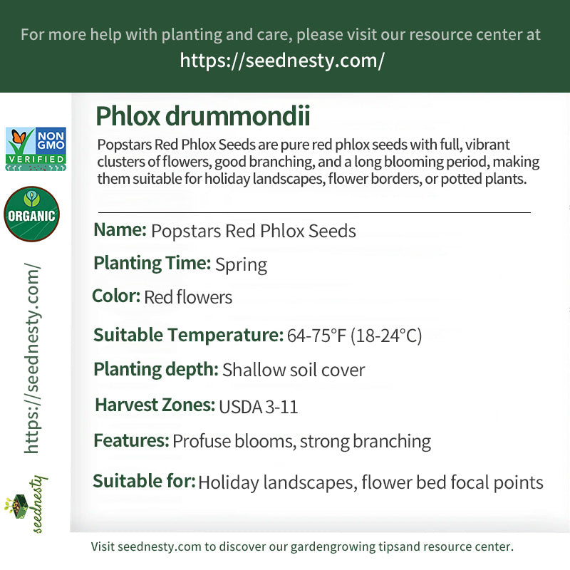 Popstars Red Phlox Seeds is a phlox variety that features a rich, vibrant color without any variegation. Its flowers blaze in the sun, instantly elevating any landscape. The flowers are arranged in dense corymbs, each containing 10-15 flowers, approximately 1-1.5 inches in diameter. The petals are thick and resistant to light rain, resisting damage from brief rainfall. The plant grows approximately 12-16 inches tall and has strong branching ability, producing 5-8 lateral branches per plant, each of which produces a cluster of flowers, resulting in approximately 30% more flowers than standard varieties. The flowering period lasts from late spring to summer, and it is moderately tolerant of heat and humidity. Proper shade during summer heat can extend the blooming period.