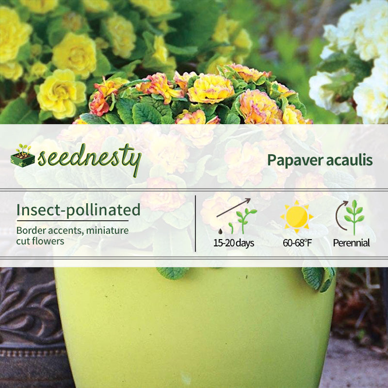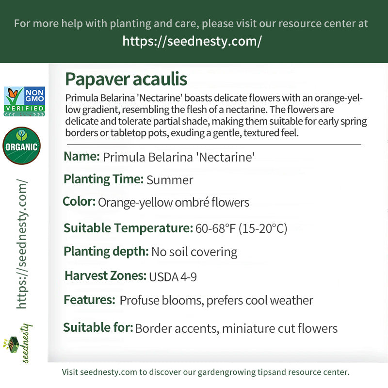 Primula Belarina 'Nectarine' stands out for its unique coloration. Its flowers, gradating from orange to yellow, resemble the flesh of a nectarine, with a natural, soft transition, resemble a "spring nectarine dessert," imbued with a gentle, textured feel. Its delicate double petals are numerous but neatly arranged, measuring approximately 1.5-2 inches in diameter. When in bloom, a single flower resembles a "mini nectarine." The plant grows approximately 7-9 inches tall, with a loose yet regular shape. Its leaves are thin, soft, and light green with fine hairs, creating a delicate touch. It tolerates partial shade and is best grown in locations with ample scattered light. Its flowering period lasts from early to late spring, and controlled temperature maintenance can extend the blooming period indoors. Suitable as a desktop plant in an office or bedroom, or planted in an outdoor border.