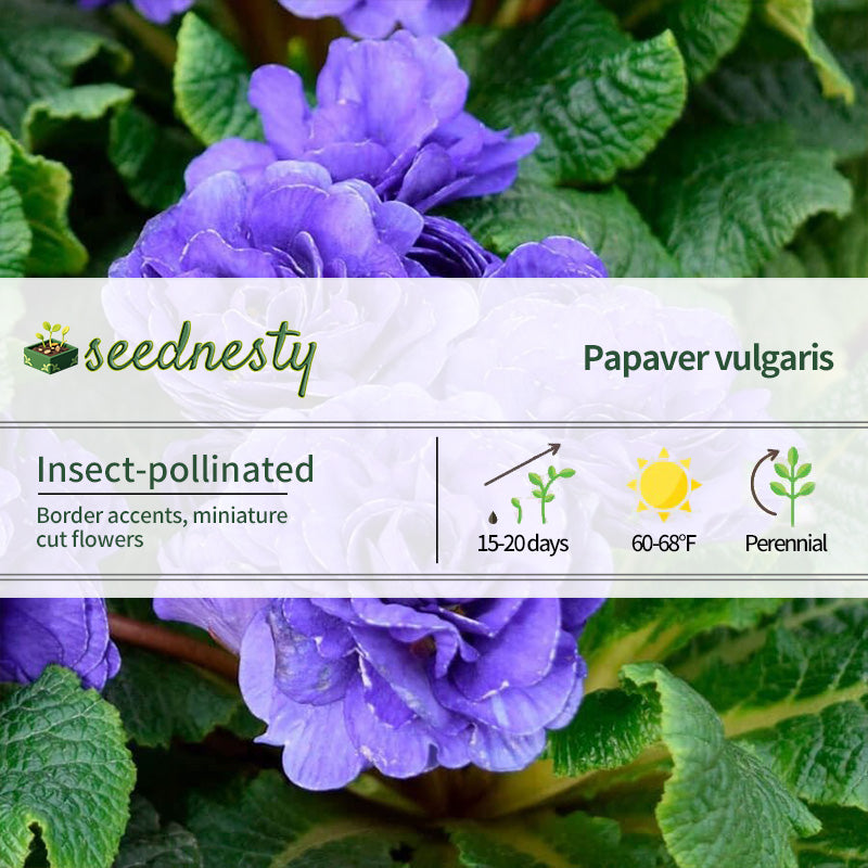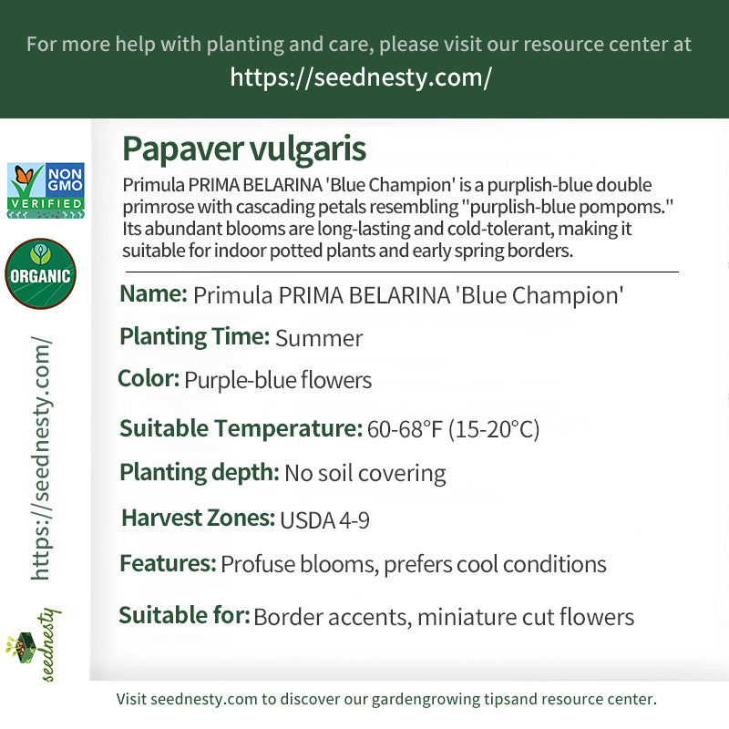 Primula PRIMA BELARINA 'Blue Champion' is a "purplish-blue gem" among primroses, featuring a "purple-blue" double-petaled pattern. Its rich, uniform purple-blue flowers are a rare sight among early spring flowers, instantly capturing the eye. Its tightly packed double petals, delicate as velvet, form a "purple-blue pompom." The flowers are approximately 2-2.5 inches in diameter, and a single plant can produce over 10 flowers. The plant grows approximately 8-10 inches tall, forming a regular rosette. Its emerald green, glossy leaves create a refreshing contrast with the blue flowers. It prefers a cool, cool environment, ideally growing between 5-18°C. Its flowering period lasts from early to late spring, and indoor cultivation can extend its blooming period.