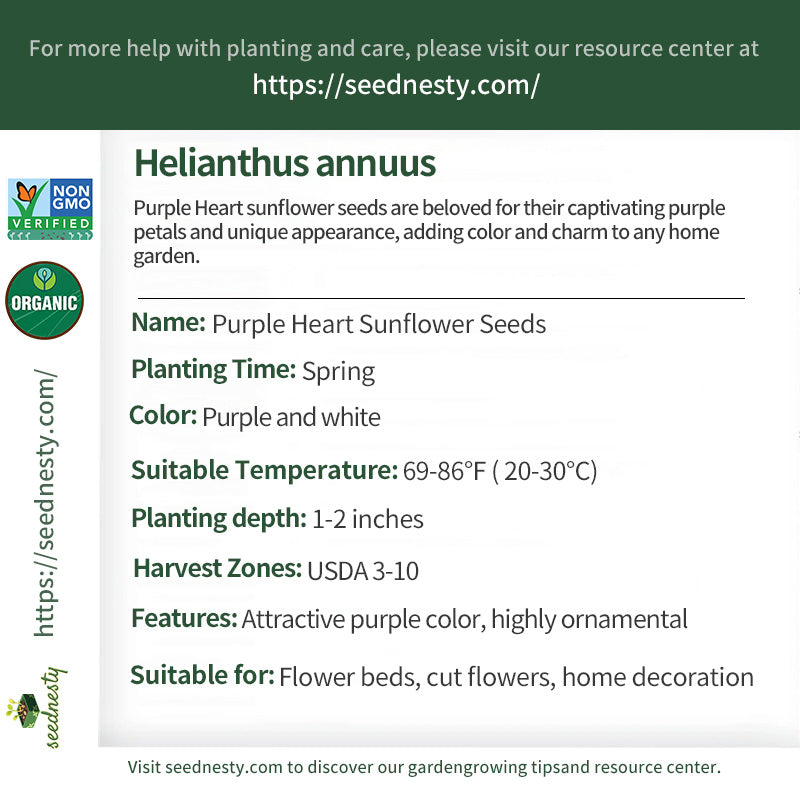 Purple Heart sunflower seeds bloom in the sun, their captivating purple petals a dreamlike hue that brings warmth and joy. Their unique appearance makes them a vibrant spot in any garden, attracting countless bees and butterflies. Imagine your family playing in the garden, surrounded by these beautiful sunflowers, filled with joy and laughter. Purple Heart sunflowers are not only perfect for flowerbed decoration, but also add a unique touch to your garden. Every time you see these flowers, you feel the charm of nature and the vitality of life, filling your life with joy and color.