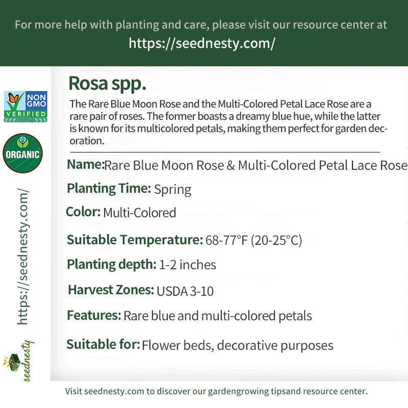 One mysterious night, seeds of the Rare Blue Moon Rose and Multi-Colored Petal Lace Rose were sown in a corner of the garden. With the arrival of spring, the dreamy blue rose and the multicolored rose gradually blossomed, seemingly dancing under the starry sky. Their unique colors attracted countless bees and butterflies, filling the garden with vibrant life. Neighbors were often drawn to these rare roses and came to admire them. Children played among the flowers, enjoying the joy of nature. Whenever the flowers bloomed, homes were filled with warmth and romance, becoming a haven for the soul. The Rare Blue Moon Rose and Multi-Colored Petal Lace Rose are more than just plants; they symbolize preciousness and beauty, inspiring people to pursue the art of living.
