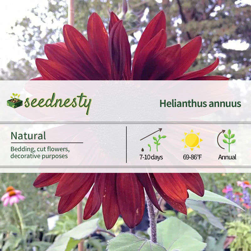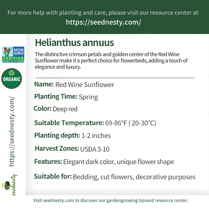 On a warm summer evening, you walk into your garden and see the blossoms of the Red Wine Sunflower like a glass of fine wine, their crimson petals shimmering captivatingly in the sunlight. Their golden centers, like a dazzling gem, captivate every passing glance. Imagine strolling through your garden, surrounded by these elegant sunflowers, a sense of tranquility and joy welling up within you. Red Wine Sunflowers are not only perfect for flowerbeds, but can also be used as cut flowers, adding a touch of luxurious charm to your home. Every time you see these flowers, you feel a sense of the mystery and beauty of nature, filling your life with color and inspiration.