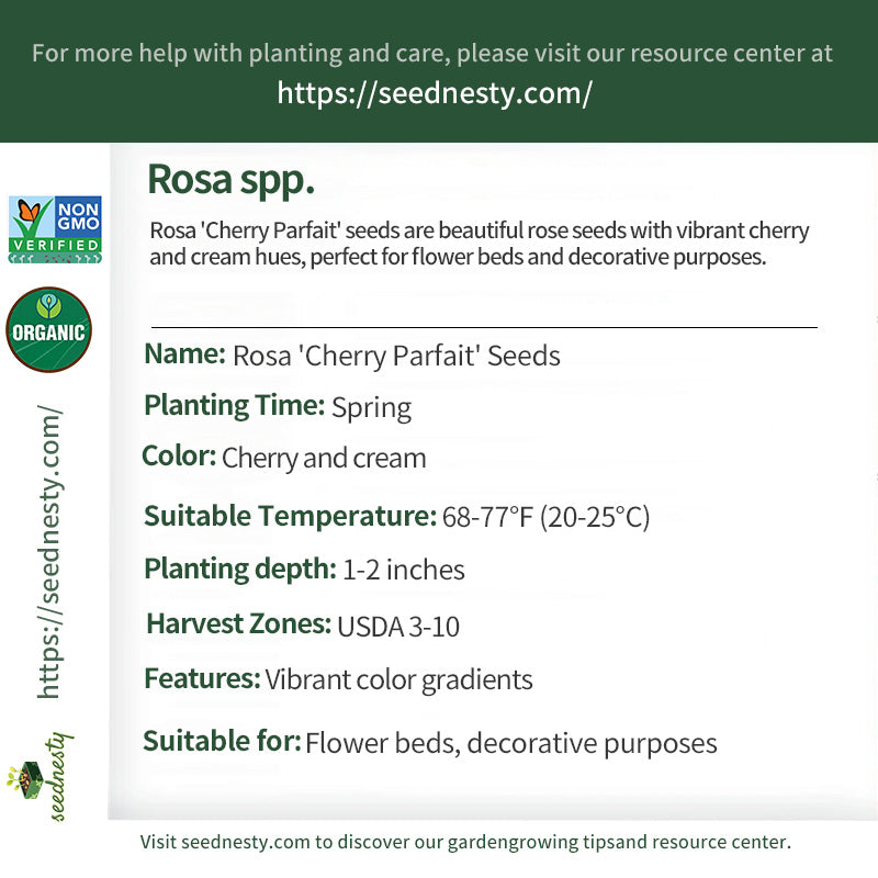 On a warm spring day, Rosa 'Cherry Parfait' seeds were sown in the garden. As the sun warmed, the vibrant cherry and cream blossoms gradually blossomed, resembling a delicious cherry milkshake, bringing endless joy. Neighbors flocked to admire the beautiful blossoms, and children happily played among them, enjoying the beauty of nature. Whenever the flowers bloomed, the garden was filled with laughter and joy, making it an ideal place for family gatherings. Rosa 'Cherry Parfait' seeds are more than just a plant; they symbolize sweetness and joy, adding infinite color to life.