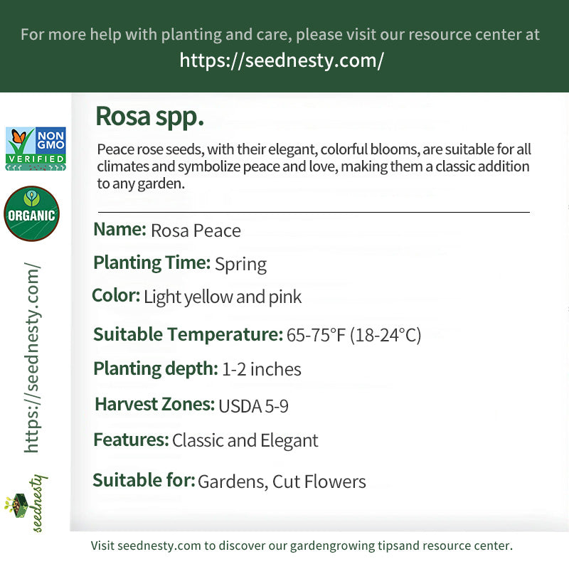 Peace rose seeds, symbolizing love and harmony, rest quietly in your hand. Each seed holds hope and beauty, waiting to take root and sprout in fertile soil. Imagine the indescribable peace and contentment you will feel as these seeds flourish under the sun and blossom into elegant flowers. The cascading petals of the Peace rose, rich in color, resemble a beautiful painting. They are not only suitable for garden planting, but also for use in bouquets, conveying a profound sense of emotion. Plant these seeds and you will have a garden filled with love and peace, a warm memory for every visitor.