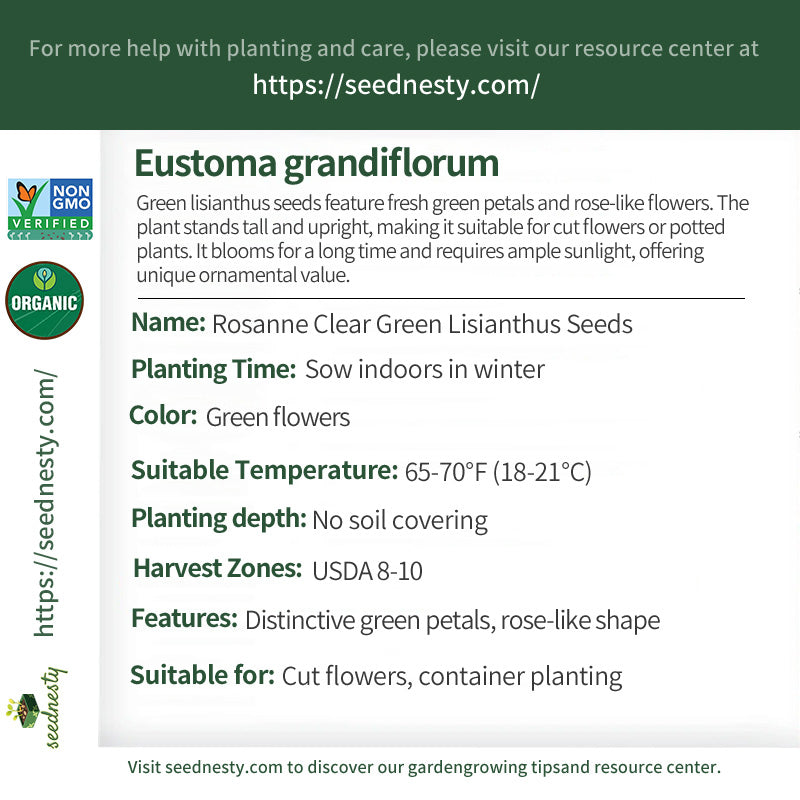 This lisianthus seed features distinctive green petals. The flowers are rounded like miniature roses, with a light, glossy texture. When in bloom, they resemble jade-carved green blossoms. The plant grows 24-30 inches tall, with upright stems, making it suitable for vase-shaped cut flowers, where it can last for over two weeks. It requires ample sunlight for optimal color, thrives in warm, humid conditions, and blooms from early summer to autumn. Whether planted alone in a pot on a balcony or alongside colorful flowers in a border, its refreshing green color creates a unique visual experience, making it an excellent choice for those seeking a niche floral style.