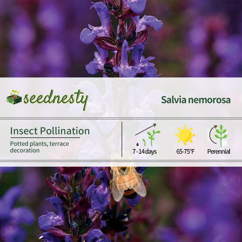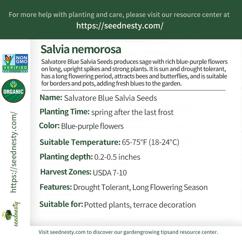 Salvatore Blue Sage seed-grown plants are the "classic"of blue-flowered gardening plants. The rich blue-purple flowers grow in dense clusters on slender, upright spikes up to 8-10 inches in length, resembling strings of spirited blue-purple wind chimes. The 24- to 30-inch tall, upright, compact plant has lance-shaped, glossy green foliage that contrasts with the blue-purple flower spikes. It is extremely adaptable, tolerating direct sunlight and blooming in hot summer conditions. Loose soil requirements, ordinary well-drained garden soil can grow.