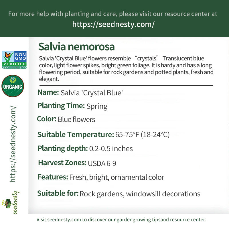 Salvia 'Crystal Blue'  is the "fresh representative"of sage, standing out with its translucent blue flowers. The flowers are as clear as "crystal", not richly saturated, but with a light softness, and the spikes are light and slender, about 7-9 inches in length, with sparse but orderly blue flowers arranged on the spikes like blue stars scattered across the sky, making them dynamic and elegant. The plant is 20-26 inches tall, with a loose but uncluttered shape and oval, textured green foliage that pairs well with the pale blue flowers for a refreshing look.