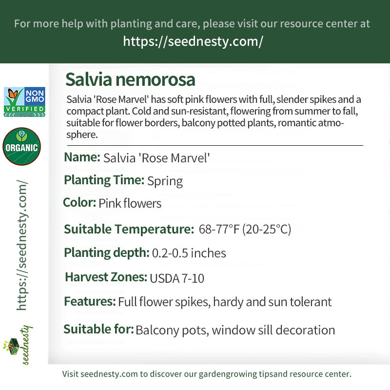 Salvia 'Rose Marvel' is a variety of sage designed for "romantic gardening", the core highlight is the unique pink flowers. The spikes are long and full, about 6-8 inches in length, with closely spaced pink flowers that bloom gradually from the base to the top of the spike, like a waterfall of pink flowers cascading down a small but dense bloom that is visually soft and healing. Plants are 18-24 inches tall, compact and uncluttered, with tiny green leaves that do not obscure the flowers at all. Its growth characteristics make it suitable for a variety of scenes, and it is hardy.
