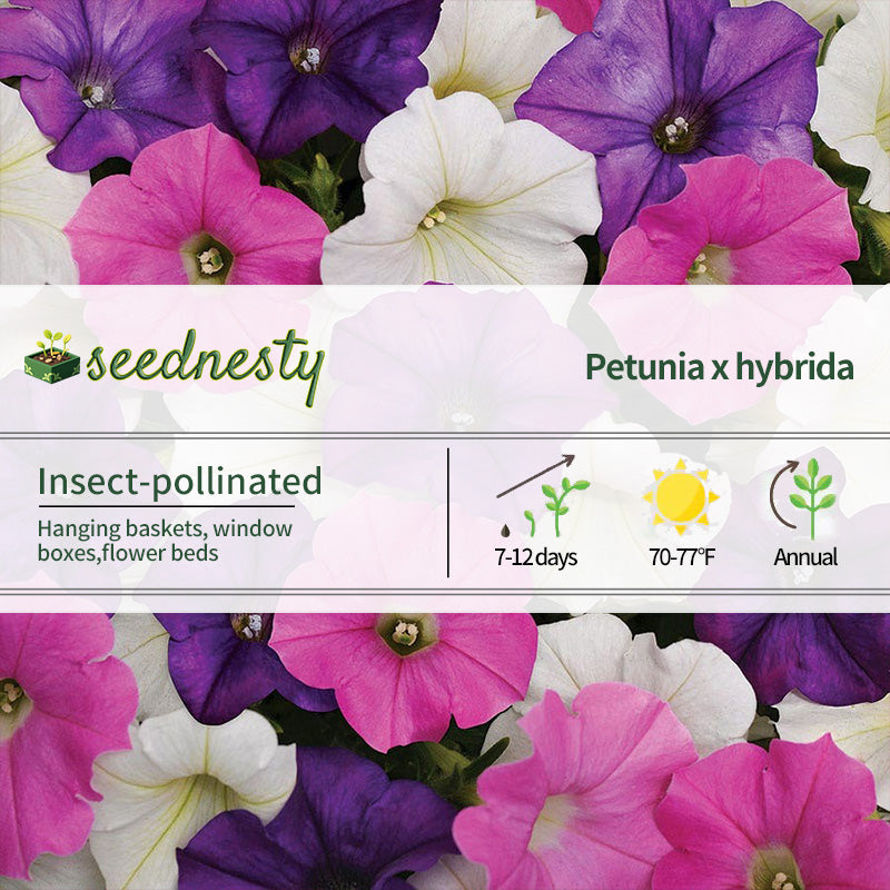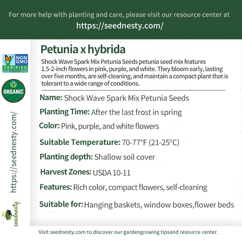 Shock Wave Spark Mix Petunia Seeds is a seed mix that produces small petunia flowers measuring 1.5-2 inches in diameter. The petunia flowers come in a rich variety of colors, including pink, purple, and white, creating a vibrant, vibrant floral experience. The compact plant, reaching a height of 7-10 inches, quickly fills any growing space. This variety boasts a remarkable early flowering characteristic. Due to its low sensitivity to day length, it blooms early in spring and can last for five months or longer. The petunia flowers are self-cleaning, dropping off old blossoms automatically, eliminating the need for manual removal. It is highly tolerant to environmental stresses such as rain, humidity, and heat, bringing long-lasting, vibrant color to any growing space.