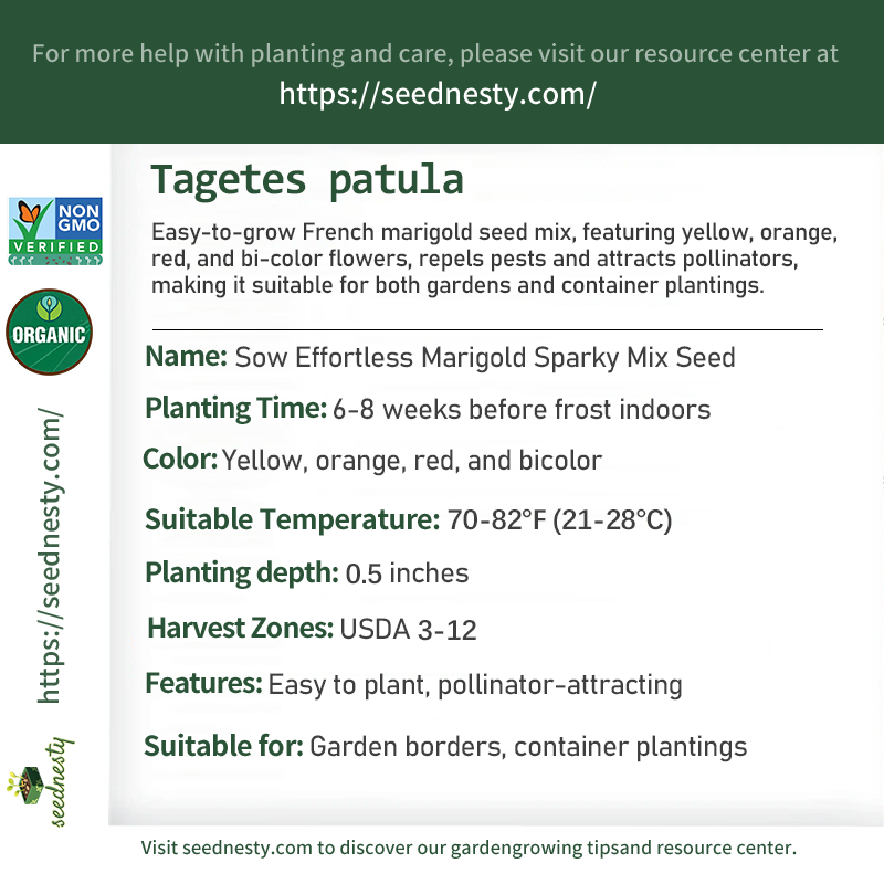 Designed for easy planting, this non-GMO, USA-grown French marigold seed mix can be raised indoors 6-8 weeks before frost or sown outdoors after frost in loose, well-drained soil. Ideal for germination at 21-28°C (70-82.4°F), seedlings emerge in 4-14 days, and flowering begins in 80-90 days. Plants reach 8-20 inches tall, with wide, curly petals in yellow, orange, red, and bi-color, blooming throughout the summer. As a companion plant, it repels pests like nematodes while attracting bees and butterflies, making it a great addition to any garden for beginners.