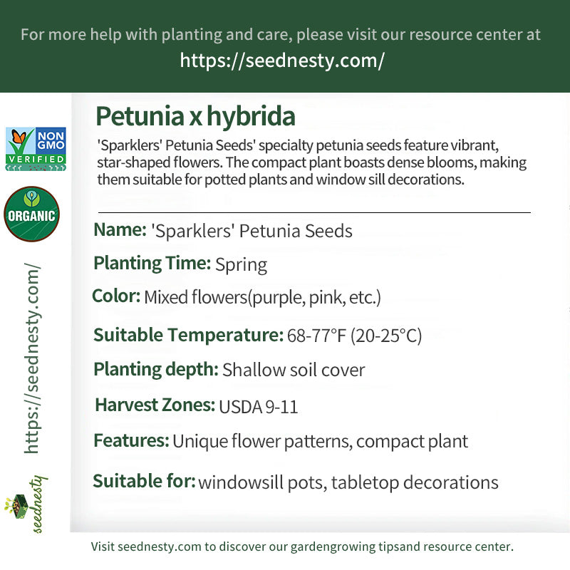 'Sparklers' Petunia Seeds is a distinctive petunia variety, its core attraction being its unique floral pattern. The petals, often in purple or pink, are dotted with star-shaped patterns, resembling the "sparks" of fireworks, creating a vibrant and unique look. The plant is compact, reaching a height of approximately 8-12 inches, with evenly branched branches. During flowering, the flowers densely cover the branches and leaves, leaving virtually no gaps. It is highly adaptable and can grow in light shade or full sun. While it tolerates moderate heat, adequate summer shade can extend its flowering period. Suitable for windowsill pots and small tabletop pots.
