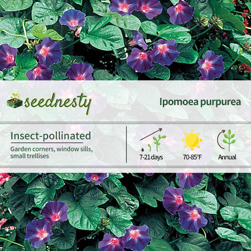 Plants grown from "Yelta Star" morning glory seeds have excellent climbing abilities and rapidly grow upward. The flowers are richly colored, deep purple, and the star-shaped pattern in the center adds a unique aesthetic. They bloom promptly each morning, creating a fresh visual experience, and gradually fade in the evening as light fades. Suitable for garden corners or window boxes, their rapid growth instantly beautifies the space and creates a focal point.