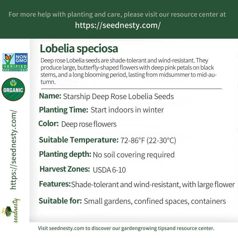 Starship Deep Rose Lobelia seeds are shade-tolerant and wind-resistant. Their large, distinctive butterfly-shaped flowers, with deep pink petals set against almost black stems, create a striking visual effect. The long blooming period begins in midsummer and continues until mid-autumn in most climates. Their upright growth habit makes them a great decorative feature in smaller garden spaces and confined areas. They are also suitable for container planting, adding a touch of charm to any space.