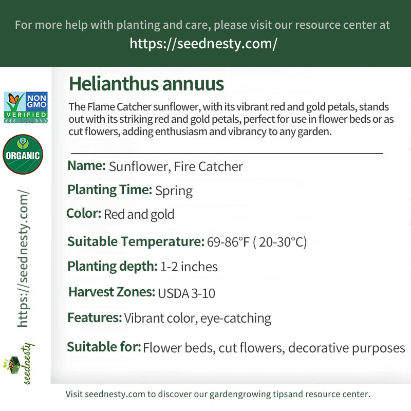On a scorching summer day, the Flame Catcher sunflower blooms in the sunlight, its vibrant red and gold petals blazing like flames, captivating every passing glance. Their unique colors instantly bring the garden to life and excitement, inviting you to join in this grand celebration of nature. Imagine your family enjoying the garden, surrounded by these vibrant sunflowers, your heart filled with joy and energy. Suitable for both flower beds and cut flowers, the Flame Catcher sunflower is a true highlight for any occasion. Its presence fills every corner with life and enthusiasm, making it an indispensable element of beauty in your life.