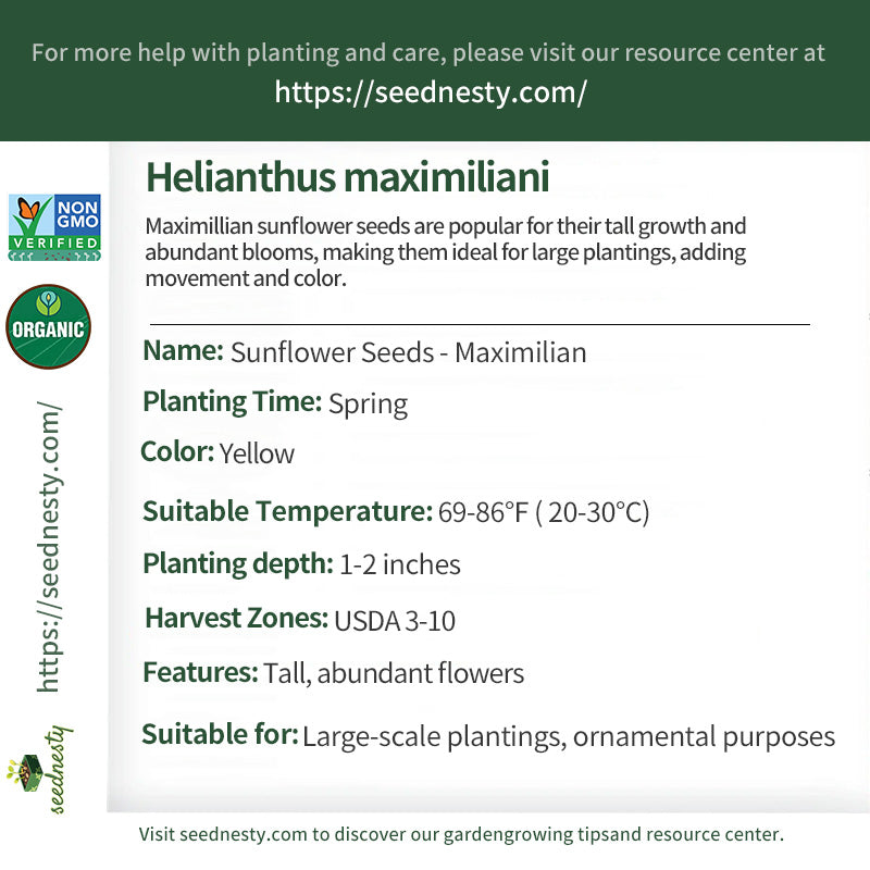 Maximillian sunflower seeds thrive in the sun, their tall flowers standing tall like giants, creating a truly stunning sight. Their abundant blooms and robust growth make them ideal for large plantings, adding a touch of movement and vitality to your garden. Imagine admiring these towering sunflowers in your garden, and you'll feel a surge of joy and satisfaction. Maximillian sunflowers are not only beautiful for viewing, but also attract birds and insects, adding life and vitality. Their presence fills your garden with color and vitality, making them an indispensable natural companion in your life.