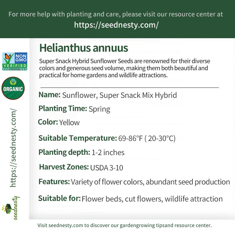 Super Snack Hybrid Sunflowers bloom in the sun, their vibrant blooms a natural palette, attracting countless bees and butterflies. Their rich and delicious seeds make them a great choice for family gatherings and outdoor activities. Imagine your family playing in the garden, surrounded by these beautiful sunflowers, filled with joy and laughter. Super Snack Hybrid Sunflowers are not only suitable for flower bed decorations, but also attract wildlife, adding life and vitality to your garden. Every time you see these flowers, you can feel the charm of nature and the vitality of life, bringing joy and color to your life.