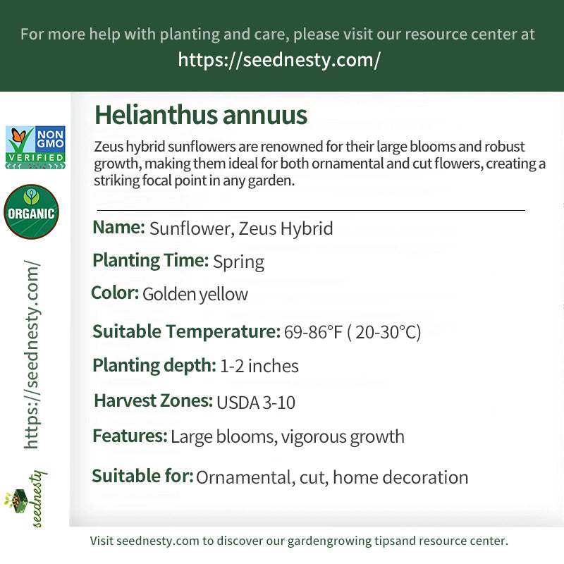 Zeus hybrid sunflowers stand tall in the sun, their large blooms dazzling like the sun, captivating countless eyes. Their robust growth makes them a focal point in any garden, seemingly showcasing their strength and beauty to the world. Imagine strolling through your garden and witnessing these towering sunflowers swaying gently in the breeze—a moment of awe and wonder. Zeus sunflowers are not only suitable for ornamental use, but also for cut flowers, offering unparalleled visual delight. Every time you see these flowers, you feel a sense of the wonder and majesty of nature, filling your life with strength and inspiration.