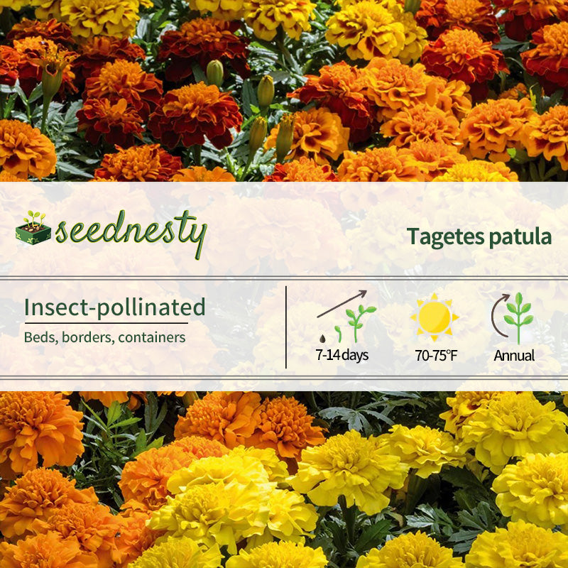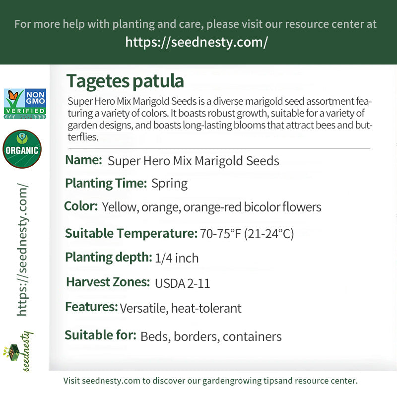 Super Hero Mix Marigold Seeds is a diverse marigold seed assortment featuring vibrant colors like yellow and orange, perfect for flower beds and borders. The plant grows quickly, tolerates heat, and thrives in full sun. Its long-lasting blooms last from summer to autumn, adding a vibrant touch of color to any garden. Super Hero Mix marigolds are not only ornamental but also attract bees and butterflies, contributing to a balanced ecosystem. They are easy to care for, requiring only full sun and adequate water, making them an ideal gardening choice.
