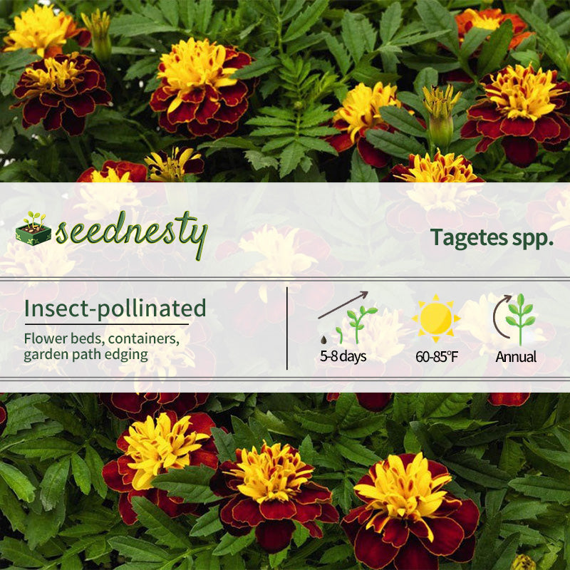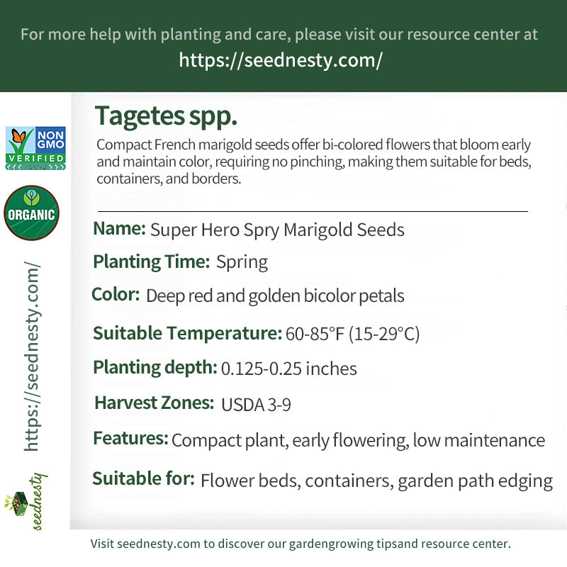 Super Hero Spry is a compact French marigold with deep red lower petals and golden upper petals, creating a unique bi-colored effect. Reaching only 8-10 inches tall and 6-8 inches wide, it's ideal for borders, containers, and garden paths. This variety blooms early, maintains uniform color, and requires no pinching. It requires well-drained soil and enjoys full sun, blooming continuously from summer to fall. It also has some resistance to soil-borne pests in tomato-growing areas.
