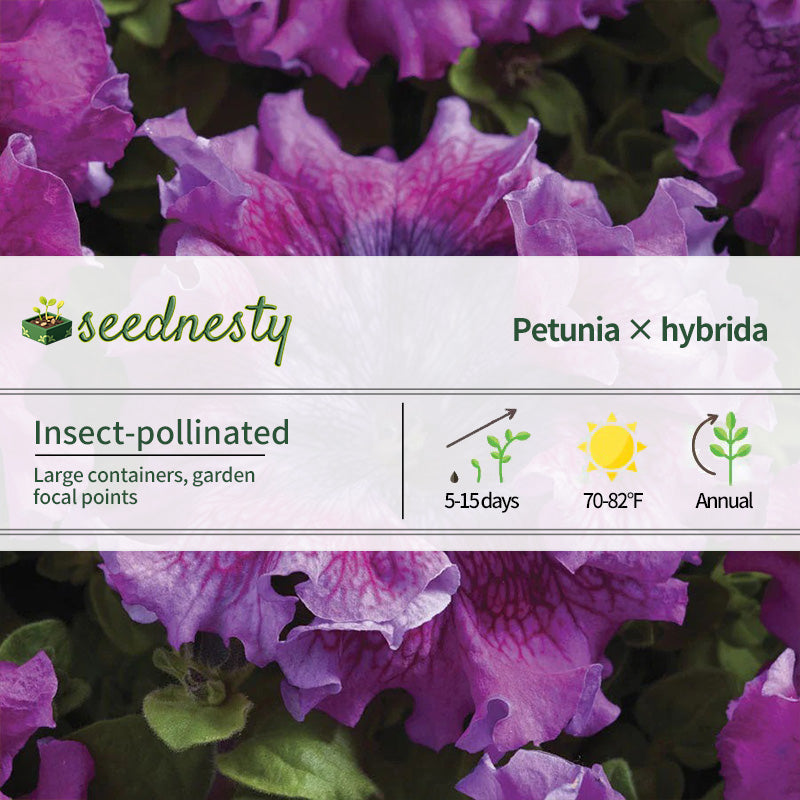 The flowers of plants grown from Superbissima Dark Purple Petunia seeds are their highlight. The flowers, up to 15 cm in diameter, are a rich, deep purple with dark veins at the throat, adding a mysterious and unique layer of color. The petals are delicately pleated and wavy at the edges, resembling the hem of an elaborate silk dress, adding an extra touch of elegance. The plants typically reach 30-40 cm in height, forming a compact, mound-like growth with numerous branches that spread evenly from the base, allowing them to naturally develop a full, rounded shape without extensive pruning. The leaves are dark green, oval, and slightly fuzzy, with a soft texture that complements the vibrant flowers and accentuates their beauty.