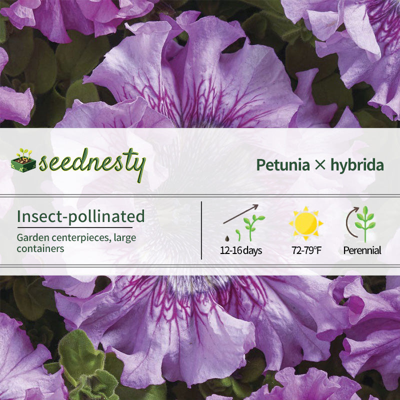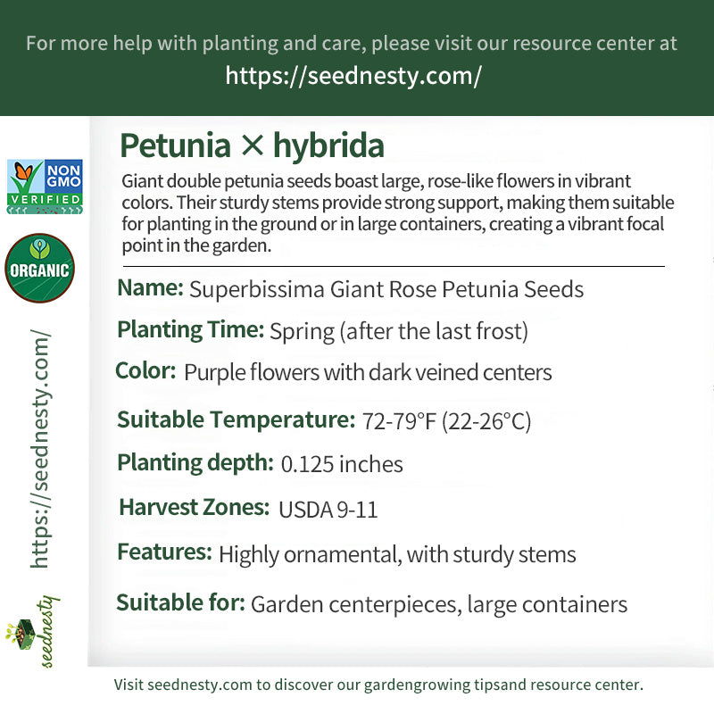 Superbissima Giant Rose petunia seeds, distinguished by their giant double petunia flowers, are a vibrant and eye-catching variety in the garden. The plants grow robustly, with thick, woody stems that provide strong support, making them resilient even under the weight of their large flowers. The leaves are dark green with fine hairs, creating a unique texture that contrasts sharply with the large flowers. The double rose-shaped flowers reach 4-5 inches in diameter, twice the size of a typical petunia. The petals are densely packed, purple, and have a dark veined center. When in bloom, they resemble miniature rose bushes, creating a striking impression.