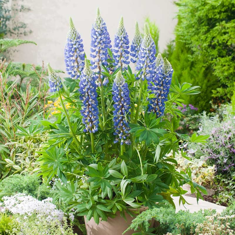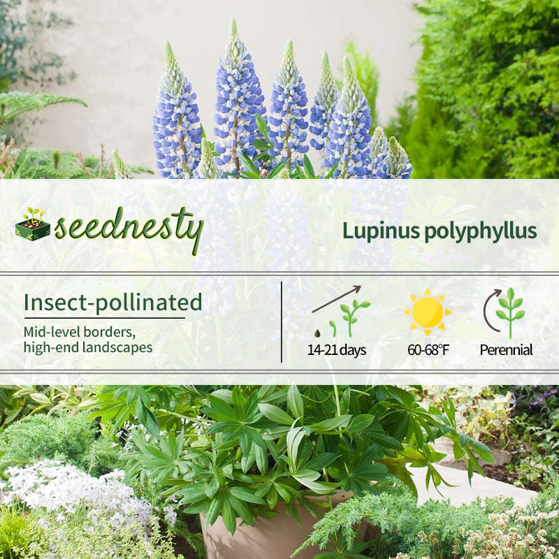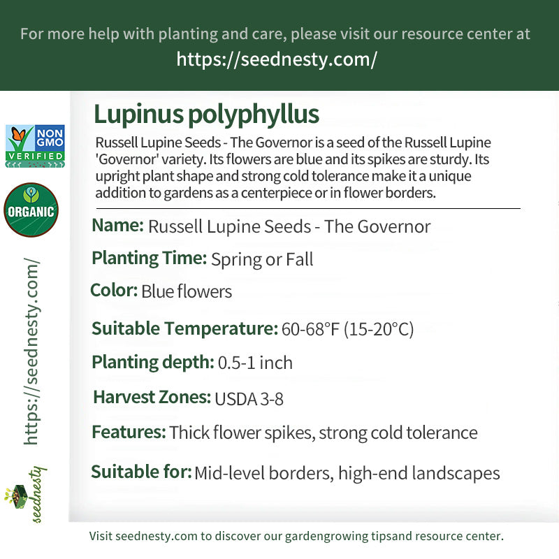 Russell Lupine Seeds - The Governor is a rare dark lupine variety. Its flowers are blue and its spikes are sturdy and slender, measuring approximately 20-24 inches in length. When in bloom, it stands tall in the garden like a column, creating a calming and recognizable style. As a classic of the Russell Lupine family, it inherits the cold and cool characteristics. After a low winter, it blooms healthily again the following spring, allowing for years of enjoyment from a single sowing. Its upright plant shape makes it suitable for centerpieces in flower borders or as a single plant in a clump, complemented by other flowers to highlight its unique color.