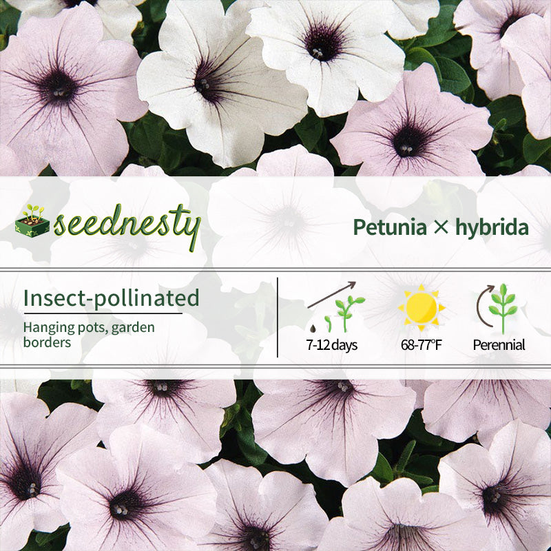 Plants grown from Tidal Wave Silver petunia seeds attract attention with their distinctive pink and white flowers. The numerous flowers, densely packed throughout the plant, create a unique silver-gray sea of blooms. Under sunlight or light, the flowers shimmer with a soft luster, creating a truly spectacular sight. The plant grows extremely quickly and has a strong spreading ability. Whether used in hanging baskets, hanging pots, or as a groundcover in flower beds, it can quickly cover a large area and create a vibrant landscape effect. The dark green, glossy leaves contrast sharply with the silver-gray flowers, further highlighting their uniqueness. Blooming continuously from spring to fall, provided adequate light and water are provided.