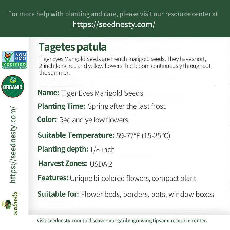 Tiger Eyes Marigold Seeds is an open-pollinated French marigold variety with a short, compact plant, approximately 1 foot tall and wide. The flowers are approximately 2 inches in diameter, and their unique two-color combination is striking: the lower single petal is red, while the upper, pompom-shaped petals are bright yellow, resembling a tiger's eye. The flowers bloom freely throughout the summer, with a long blooming period, making them suitable for sunny gardens, pots, or windowsills. Not only does it offer high ornamental value, it also helps vegetable growers reduce root-knot nematode infestation on vegetables like tomatoes and peppers. It is a beautiful and practical garden variety that has been popular in gardens for over a century.