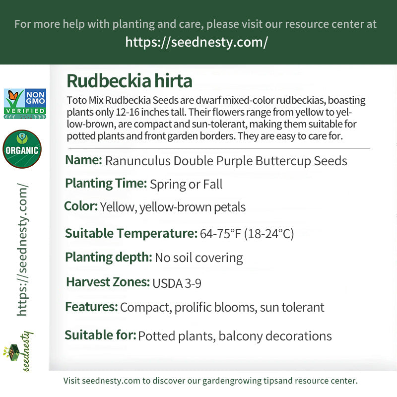 Toto Mix Rudbeckia is a "dwarf star" among rudbeckias. Plants grown from seeds reach only 12-16 inches tall, with a compact, ball-shaped form that requires no pruning to maintain its shape, making it ideal for small spaces. The flowers range in warm hues like yellow and yellow-brown, and are approximately 2-3 inches in diameter. Although smaller than typical rudbeckias, they are abundant, with 15-20 blooms per plant, creating a "golden ball"-like appearance at peak bloom. The small, lanceolate, light green leaves grow closely around the stem, avoiding obstruction. Toto Mix Rudbeckia is sun- and drought-tolerant, blooming even in high-temperature balcony conditions. Its flowering period lasts from summer to autumn, making it highly adaptable and easy for even beginners to care for.