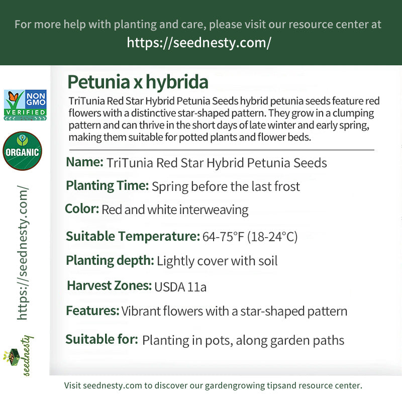 TriTunia Red Star Hybrid Petunia Seeds boasts striking red flowers with a distinctive star-shaped pattern on the petals, which stand out against the backdrop of green foliage. The plants grow in a clumping pattern, with a moderate height and width, typically around 10-12 inches. Their advantage lies in their low light requirements, allowing them to grow and bloom even in the short, low-light conditions of late winter and early spring. They are suitable for planting in various pots and look beautiful both indoors and outdoors. They can also be used in flower beds and combined with other flowers to create a vibrant and colorful landscape.