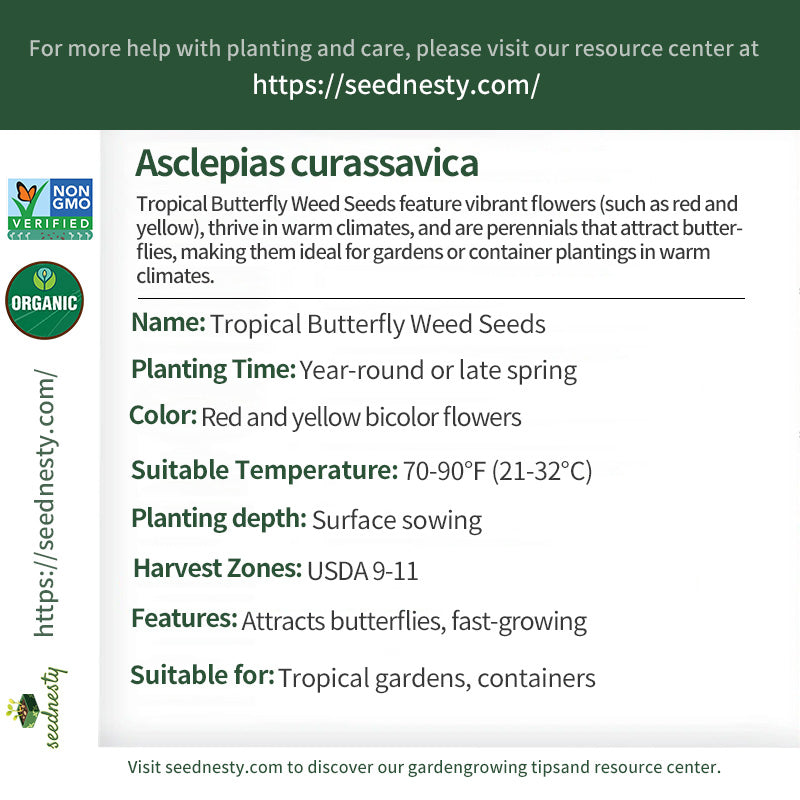 The tropical butterfly weed (Asclepias curassavica) to which these seeds correspond is a warm-climate perennial. Its vibrant flowers, often a combination of red and yellow, form drooping clusters of flowers with a unique shape, and bloom nearly year-round in warm regions. It prefers high temperatures and humidity and is intolerant of extreme cold, making it suitable for cultivation in USDA hardiness zones 9-11. The plant grows vigorously, reaching 2-3 feet in height, with lustrous emerald green leaves. As a key butterfly-attracting plant in tropical regions, it adds vitality to gardens, balconies, or container landscapes. It grows quickly and blooms shortly after sowing, making it ideal for landscapes seeking a quick effect.