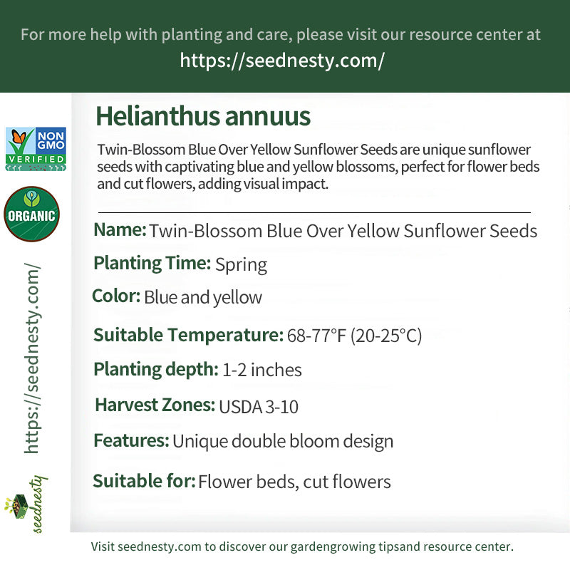 On a sunny spring day, Twin-Blossom Blue Over Yellow Sunflower Seeds were sown in the garden. As the sun shone, these unique sunflowers gradually emerged from the soil, their blossoms displaying a captivating blue and yellow hue, seemingly showcasing their beauty to the sky. Neighbors flocked to admire the vibrant blooms, while children happily played among them, enjoying the beauty of nature. Whenever the flowers bloomed, the garden was filled with laughter and joy, becoming an ideal place for family gatherings. Twin-Blossom Blue Over Yellow Sunflower Seeds are more than just plants; they symbolize creativity and vitality, adding endless joy to life.