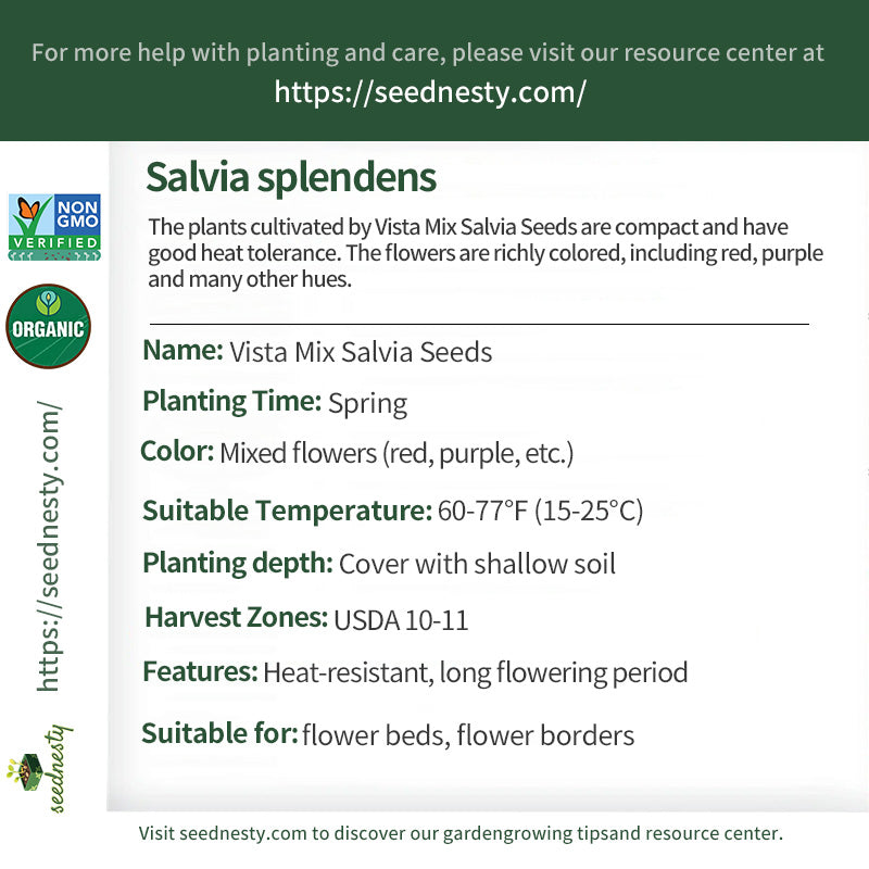 The plants cultivated by Vista Mix Salvia Seeds are very special and have excellent heat tolerance. The plant has a compact shape, with dark green and vigorous leaves. In late spring, flowers bloom early. From then on, until the frost arrives, they remain in full bloom. The flower spikes are relatively long, with flowers of various colors such as red and purple growing densely on them. These flowers can effectively attract hummingbirds, butterflies and so on, adding a lively beauty to the garden. It can be planted in flower beds as a color embellishment and is also very suitable for growing in containers.
