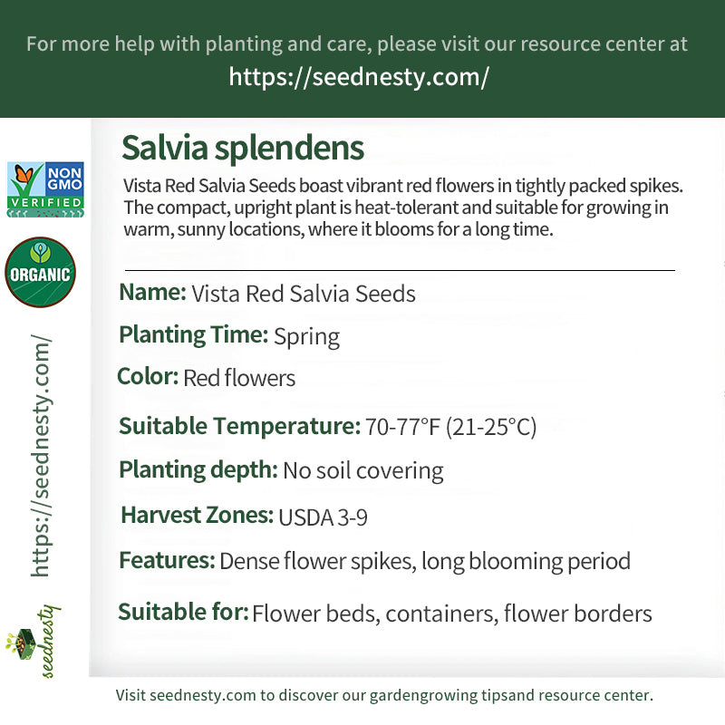 Plants grown from "Vista Red" salvia seeds have striking, bright red flowers in tightly packed spikes, creating a striking visual impact. The plant maintains a compact, upright form and boasts excellent heat tolerance, maintaining excellent condition even in hot weather. Planted in a sunny flowerbed or border, or placed as a potted plant in a well-lit patio or window, it blooms continuously from summer onwards, maintaining its vibrant flowers and dark green foliage throughout the blooming season, adding a warm atmosphere to any space.
